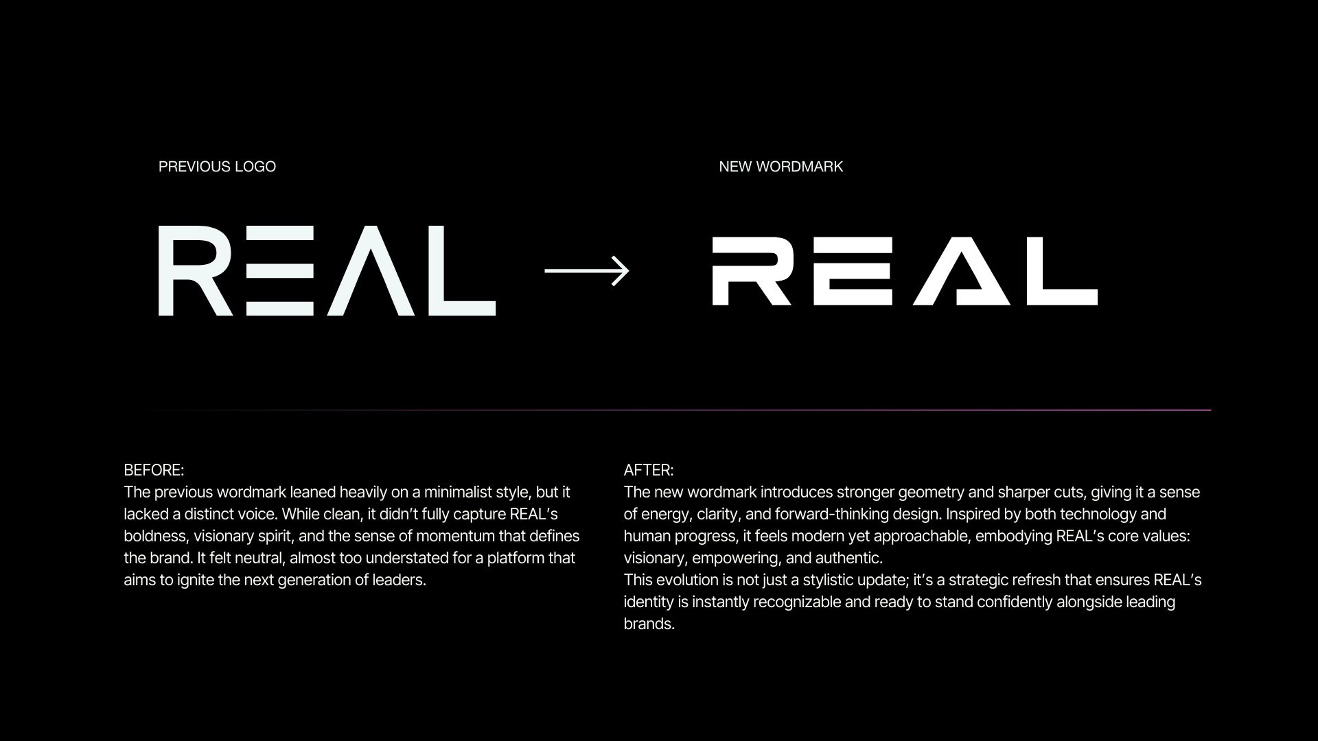 team, I worked on the full redesign and rebrand for REAL, developing the visual system alongside pitch decks and presentation materials.
